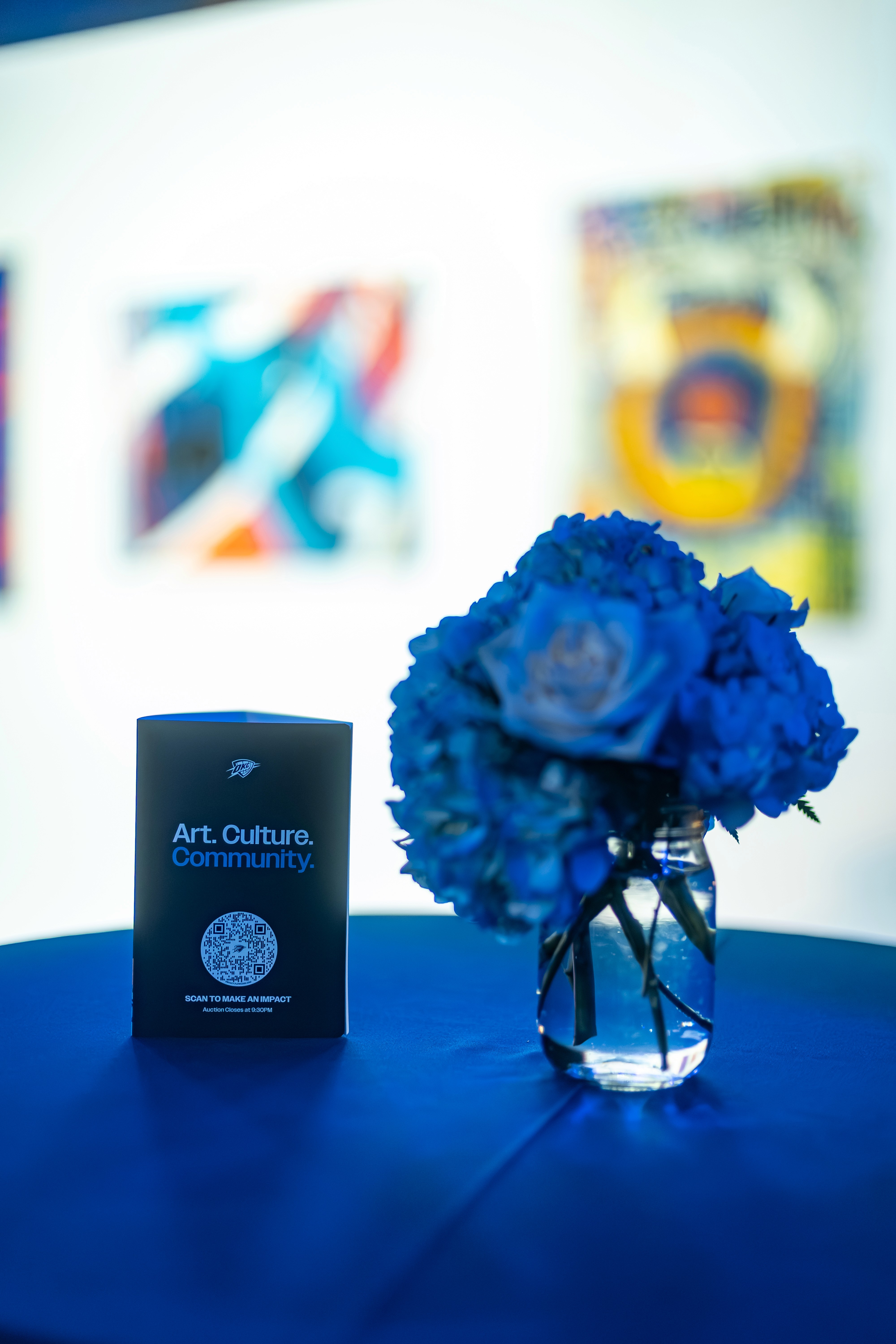 Developed a refined visual system that merged art-world cues with the bold presence of the Thunder arena. The branding extended across logo design, museum-style artwork tags, environmental signage, credentials, event programs, table tents, and large-scale graphics, transforming the court into a curated exhibition space. A looping artwork feature on the main jumbotron amplified visibility and unified the in-arena experience. The inaugural event exceeded its fundraising goal, generating $72,100 toward a $50,000 target for the Thunder Community Foundation.